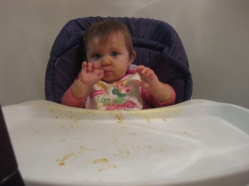 and she also likes to rub the food all over her face and hair while she's eating.